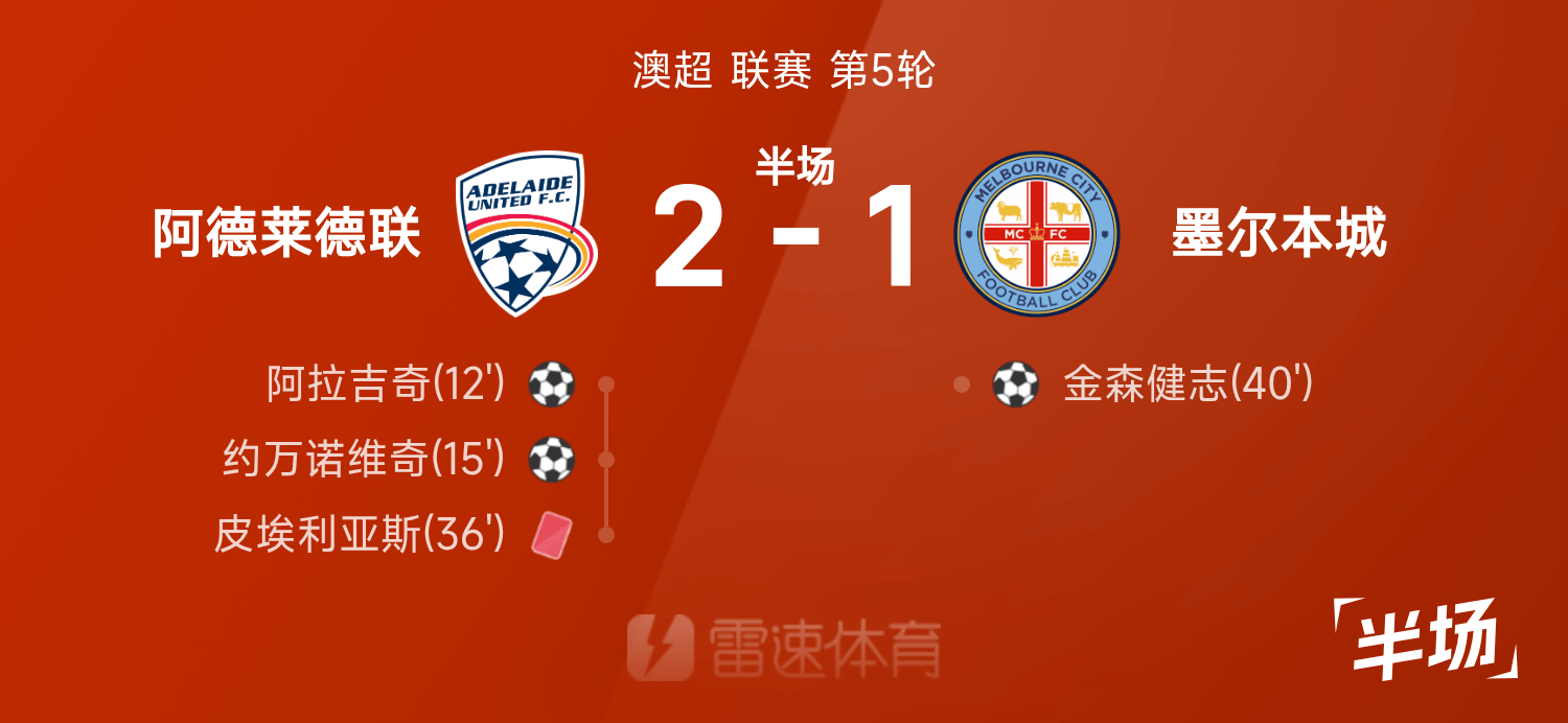 澳超半場(chǎng):皮埃利亞斯染紅,十人阿德萊德聯(lián)暫2-1墨爾本城