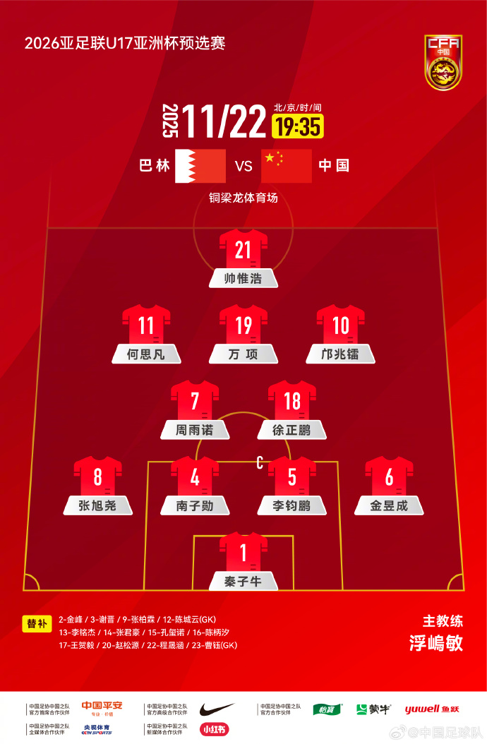 國足U17vs巴林首發(fā):鄺兆鐳、帥惟浩、萬項均出戰(zhàn)