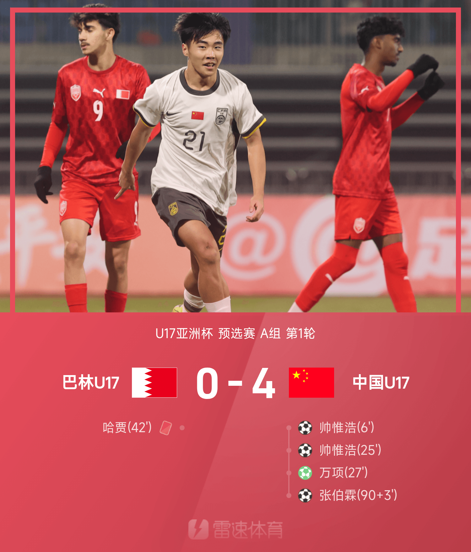 U17亞洲杯戰(zhàn)報:帥惟浩雙響,萬項傳射,中國4-0巴林