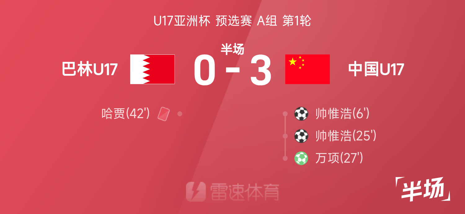 U17亞洲杯半場:帥惟浩雙響,萬項點射,中國暫3-0巴林