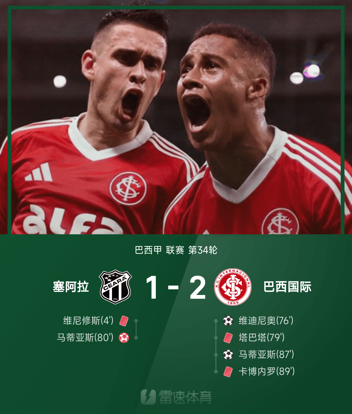 雷速體育11月21日訊 25賽季巴西甲聯(lián)賽第34輪,巴西國(guó)際2-1戰(zhàn)勝塞阿拉。