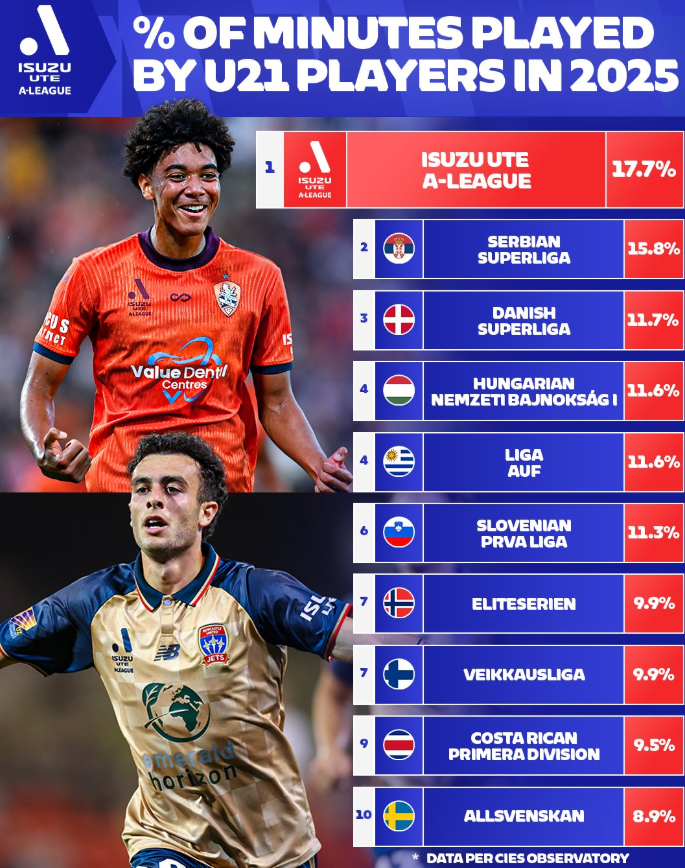 雷速體育11月21日訊 根據(jù)CIES足球天文臺(tái)發(fā)布的數(shù)據(jù),2025年度澳超聯(lián)賽本土U21球員出場(chǎng)時(shí)間占比,在全球50個(gè)頂級(jí)足球聯(lián)賽中排名第一,成