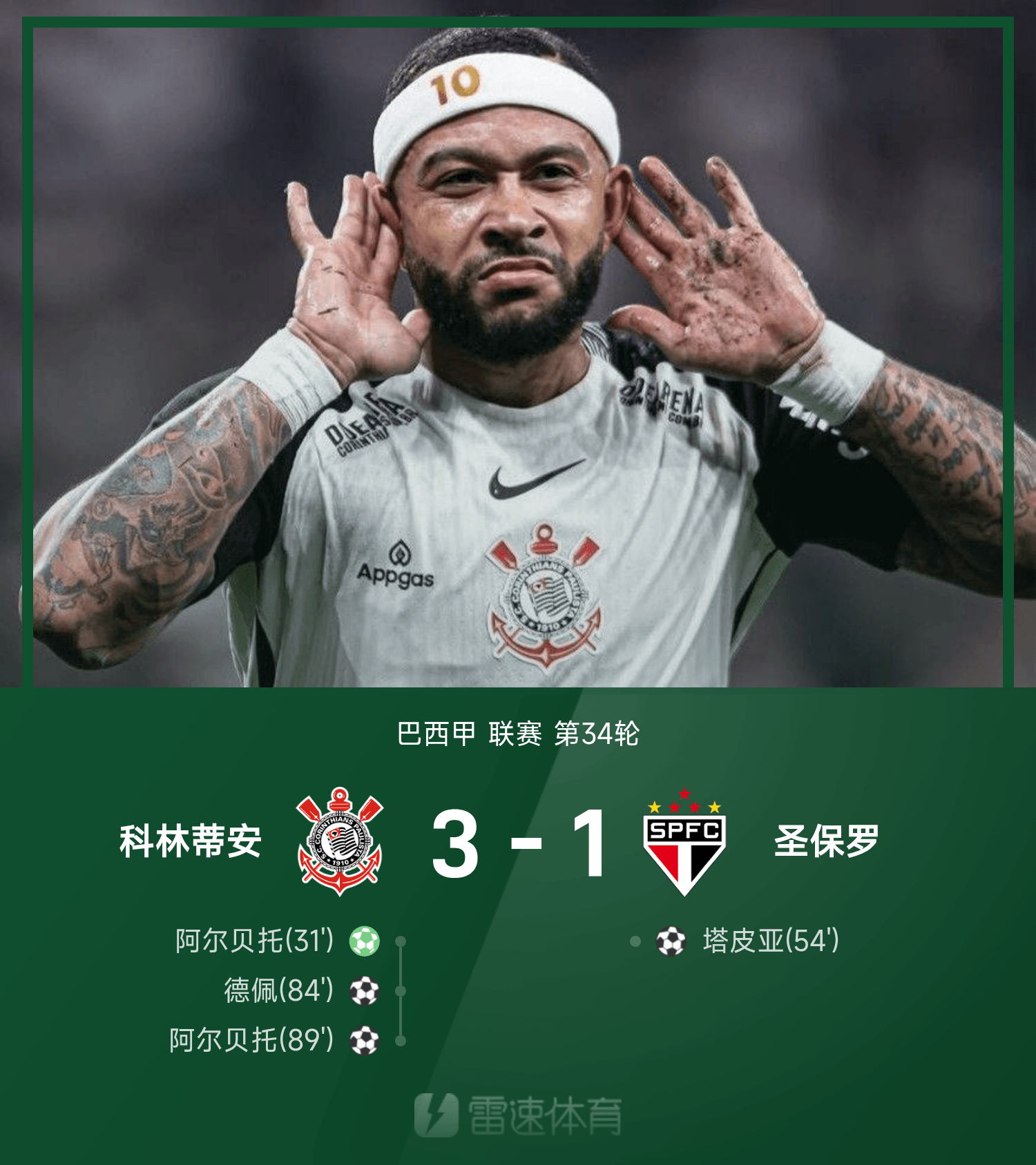 巴西甲戰(zhàn)報(bào):阿爾貝托雙響,德佩建功,科林蒂安3-1圣保羅