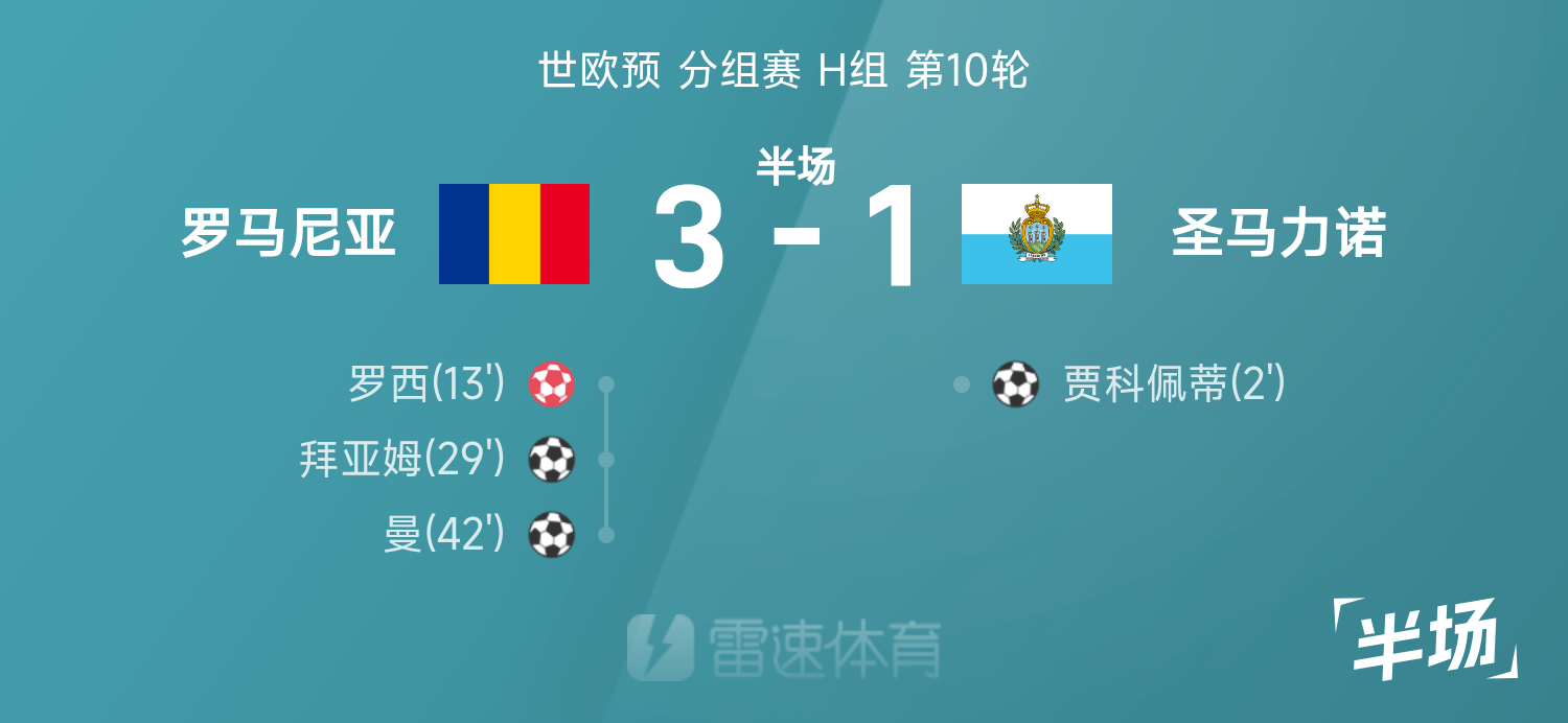 世歐預(yù)半場(chǎng):拜亞姆破門,羅西烏龍,羅馬尼亞3-1圣馬力諾