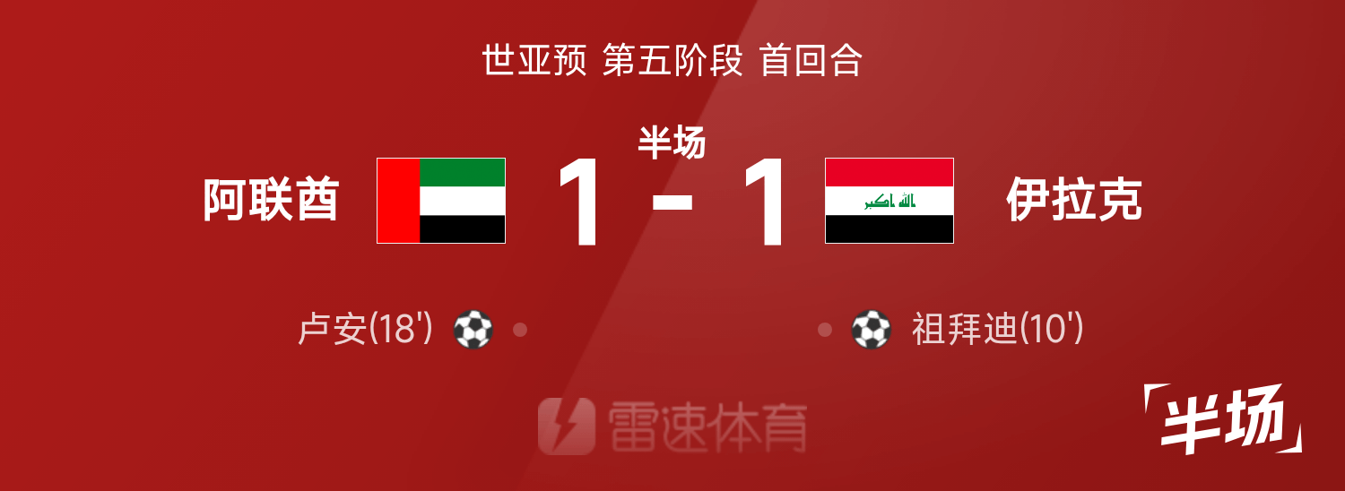 雷速體育11月14日訊 26賽季世亞預(yù)第五階段首回合,阿聯(lián)酋迎戰(zhàn)伊拉克。半場(chǎng)戰(zhàn)罷,雙方比分暫為阿聯(lián)酋1-1伊拉克,盧安、祖拜迪破門建功。