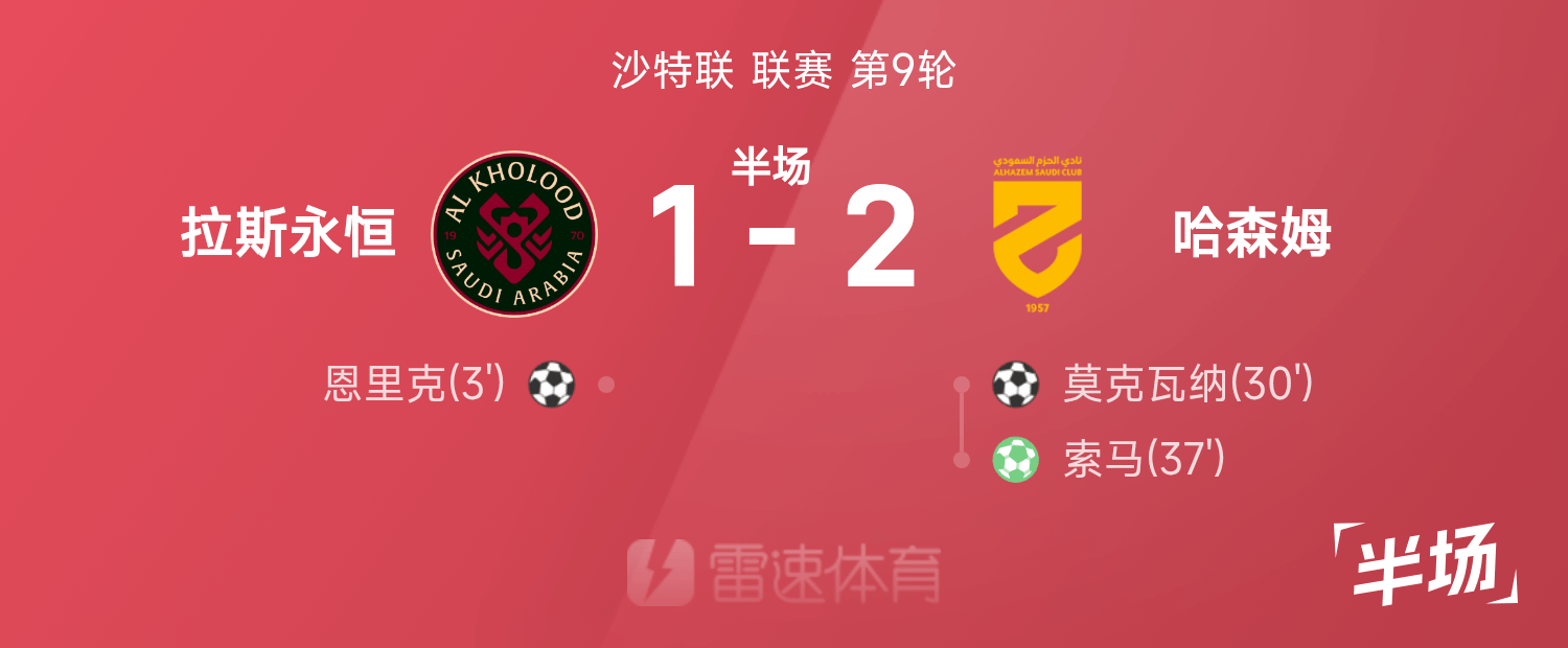 雷速體育11月21日訊 25/26賽季沙特聯(lián)聯(lián)賽第9輪,拉斯永恒迎戰(zhàn)哈森姆。開場僅僅3分鐘,恩里克閃擊破門,莫克瓦納扳平比分之后又造點,索馬主罰命中反超。半場戰(zhàn)罷,哈森姆暫2-1領(lǐng)先拉斯永恒。