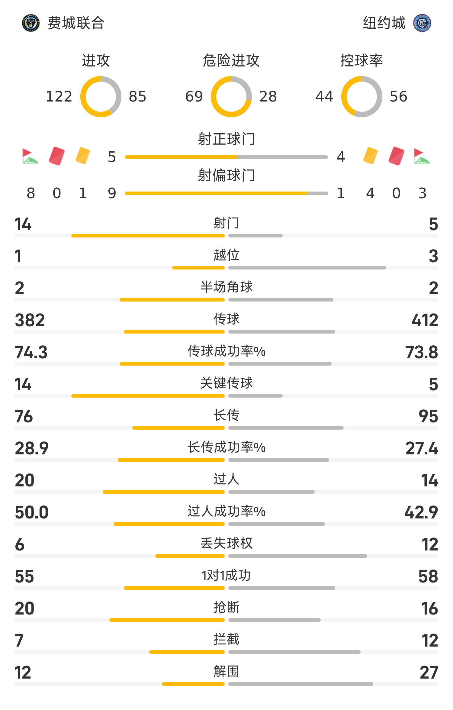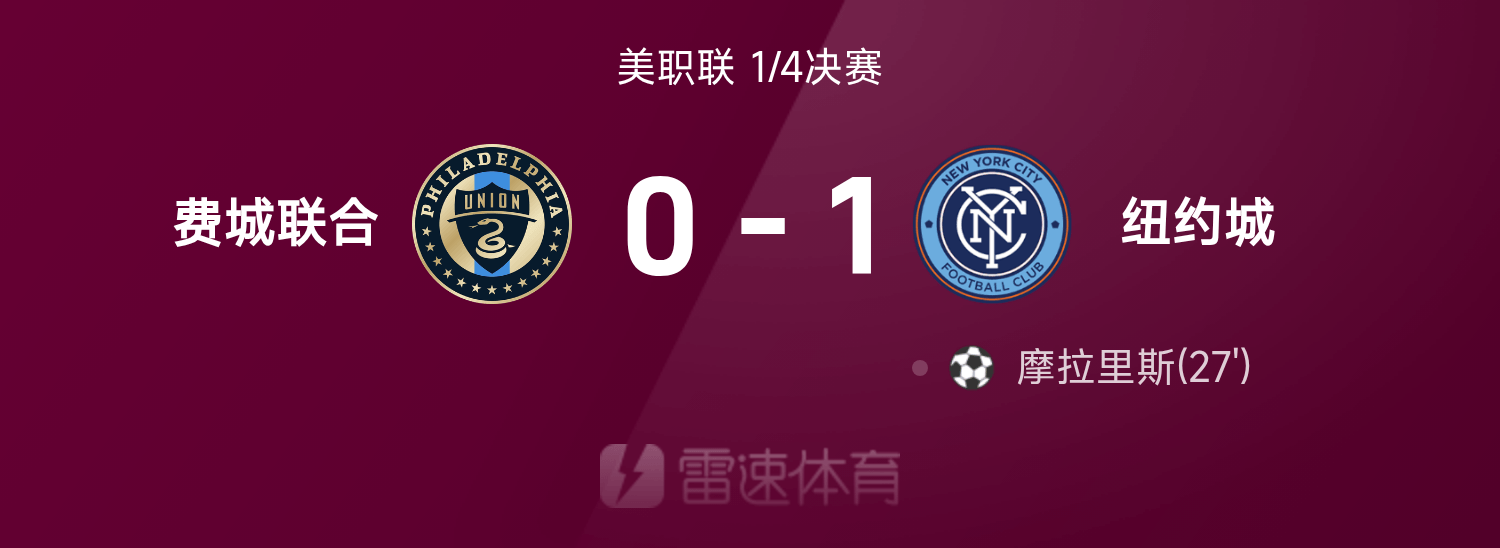 雷速體育11月24日訊 25賽季美職聯(lián)1/4決賽,紐約城1-0戰(zhàn)勝費城聯(lián)合。全場比賽,摩拉里斯破門建功。作為常規(guī)賽第一,費城聯(lián)合被淘汰出局。而東部決賽,紐約城將對陣梅西領銜的邁阿密國際。