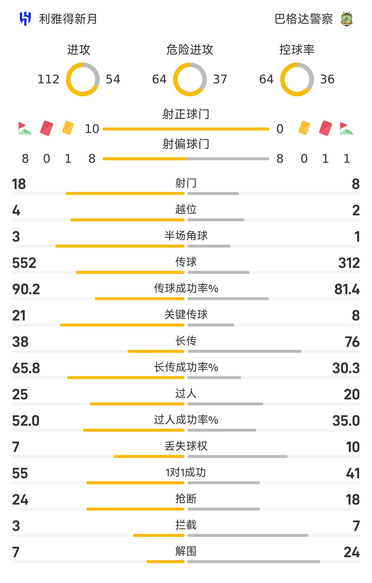 45’馬爾科姆傳中,萊昂納多頭球破門,利雅得新月1-0巴格達(dá)警察