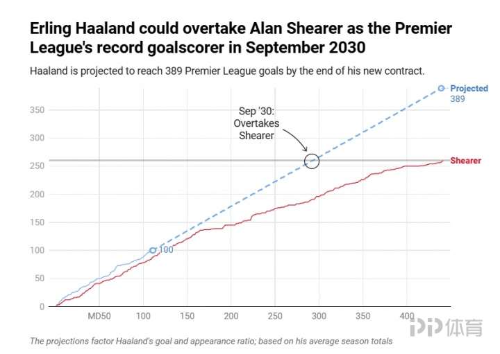 如果哈蘭德能保持目前的良好狀態(tài),直到他九年半合同結(jié)束,他最終將達(dá)到389球——比希勒多129球。