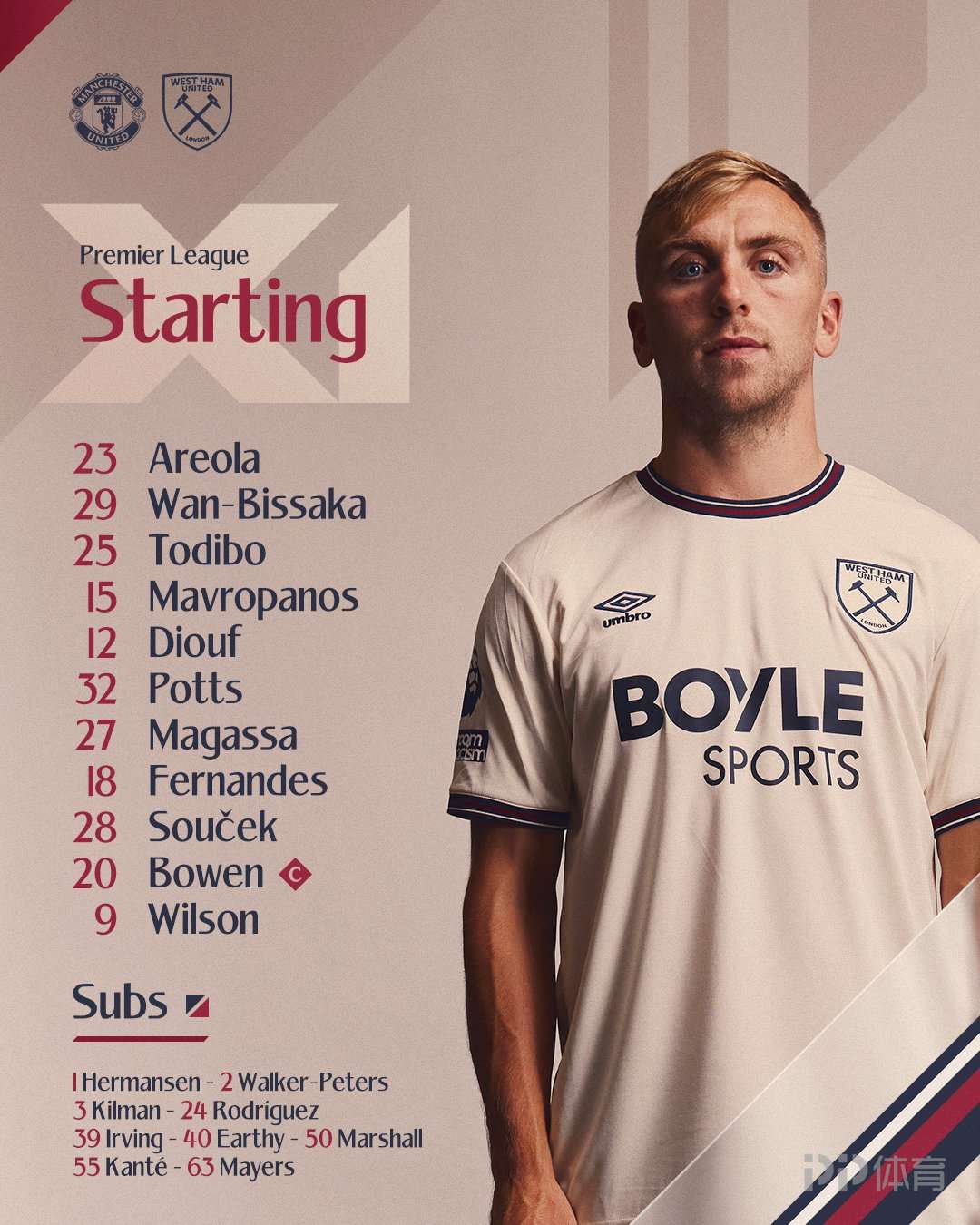 西漢姆聯(lián)首發(fā):23-阿雷奧拉、12-迪烏夫、25-托迪博、29-萬-比薩卡、15-馬夫羅帕諾斯、18-費(fèi)爾南德斯、27-馬加薩、32-波茨、28-紹切克、20-鮑恩、9-威爾遜