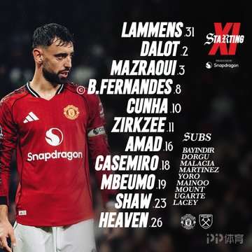 曼聯(lián)首發(fā):31-拉門斯、26-海文、2-達(dá)洛特、3-馬茲拉維、23-盧克-肖、8-B費(fèi)、18-卡塞米羅、16-迪亞洛、11-齊爾克澤、19-姆伯莫、10-庫尼亞