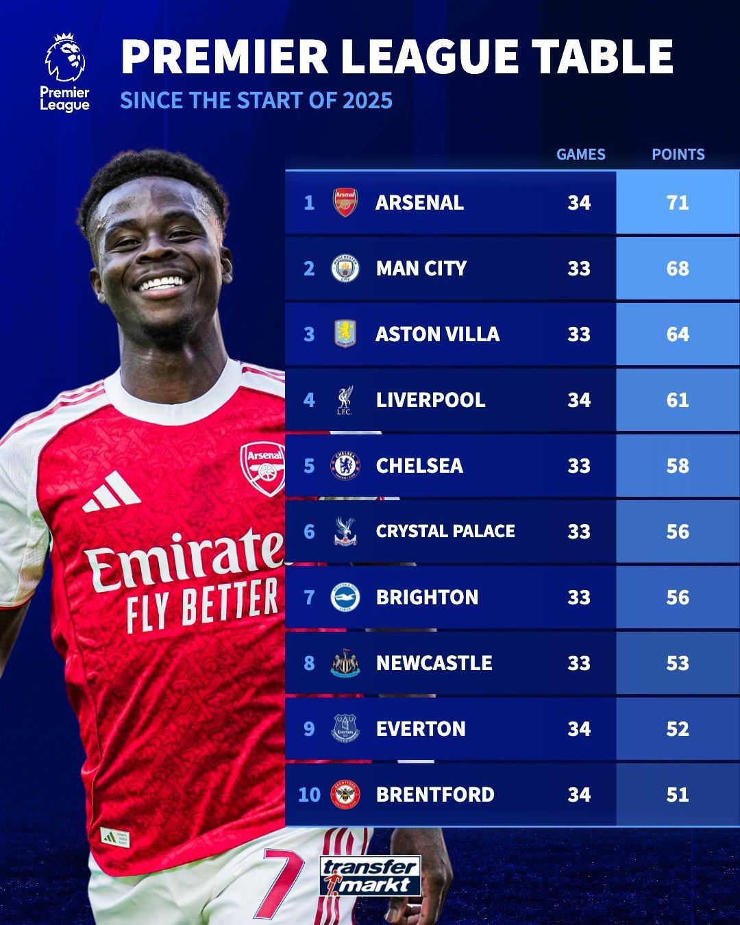 德國(guó)轉(zhuǎn)會(huì)市場(chǎng)網(wǎng)站列出了2025年至今英超積分榜,阿森納以71分鐘居首,曼城以68分第二,維拉以64分排名第三。