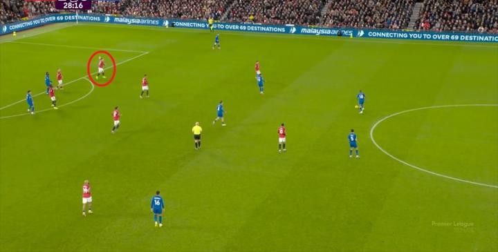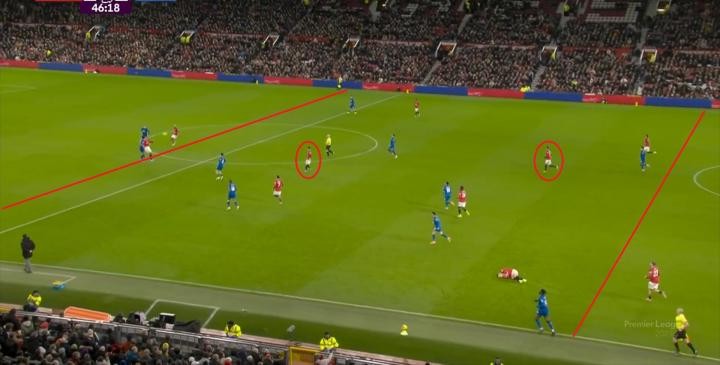 隨后曼聯(lián)在遠(yuǎn)端被伯恩茅斯繞出來,你就可以再次發(fā)現(xiàn)這個(gè)424有多么的空曠了: