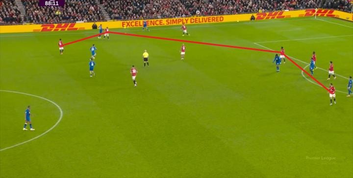 包括在這場(chǎng)比賽0-0的時(shí)候,曼聯(lián)清晰地展現(xiàn)了自己用三后衛(wèi)打四后衛(wèi)的優(yōu)勢(shì),也就是翼衛(wèi)可以徹底將寬度拉開,于是在伯恩茅斯人盯人的防守體系的幫助下,曼聯(lián)的進(jìn)攻非常流暢,特征就是左右橫移起來非常輕松和簡(jiǎn)單: