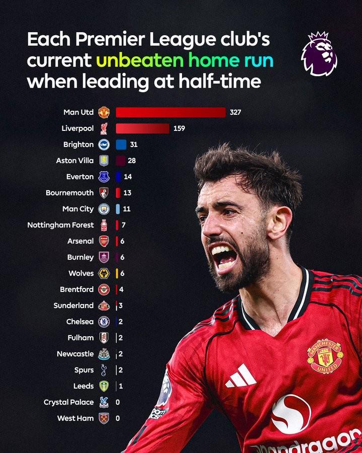 曼聯(lián)上一次在聯(lián)賽主場半場領先的情況下輸球得追溯到1984年5月,當時他們1-2遭伊普斯維奇逆轉,自那以來,曼聯(lián)在聯(lián)賽主場半場領先的情況下已經(jīng)連續(xù)393場保持不敗,戰(zhàn)績?yōu)?59勝34平。